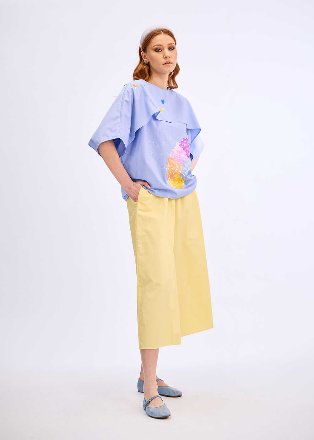 Descoperă o piesă vestimentară care emană prospețime și o eleganță jucăușă. Această bluză, confecționată din bumbac poplin de înaltă calitate într-o nuanță delicată de bleu, impresionează prin croiala sa sculpturală, definită de volanul amplu tip capă care îmbracă umerii cu fluiditate. Elementul central este pictura manuală reprezentând o păpădie multicoloră, realizată cu pigmenți speciali pentru textile. Delicatețea păpădiei în nuanțe vibrante pe fundalul bleu creează un contrast spectaculos și plin de optimism.