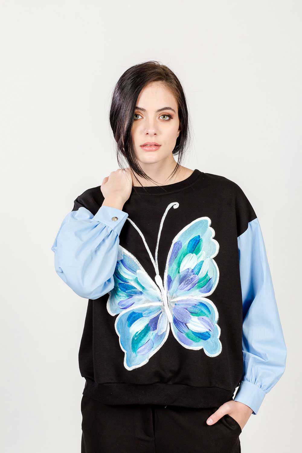 “Linda” este un mix dintre bluza clasică de trening și o cămașă. Mânecile bufante stil cămașă au manșete cu închidere cu capse metalice şi sunt realizate din bumbac poplin bleu. Partea centrală a bluzei este croită din bumbac stil trening. Pictura este realizată manual, folosind diverse tonuri de albastru. Poart-o de fiecare dată când vrei o ținută casual deosebită fară să depui prea mult efort. Accesorizeaz-o cu o pereche de jeanși negri și loafers și ținuta este gata.
