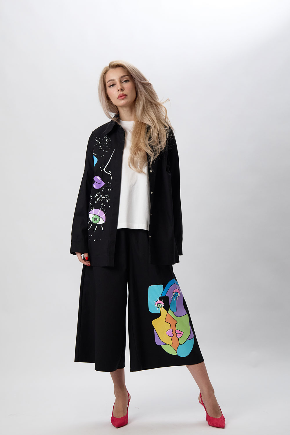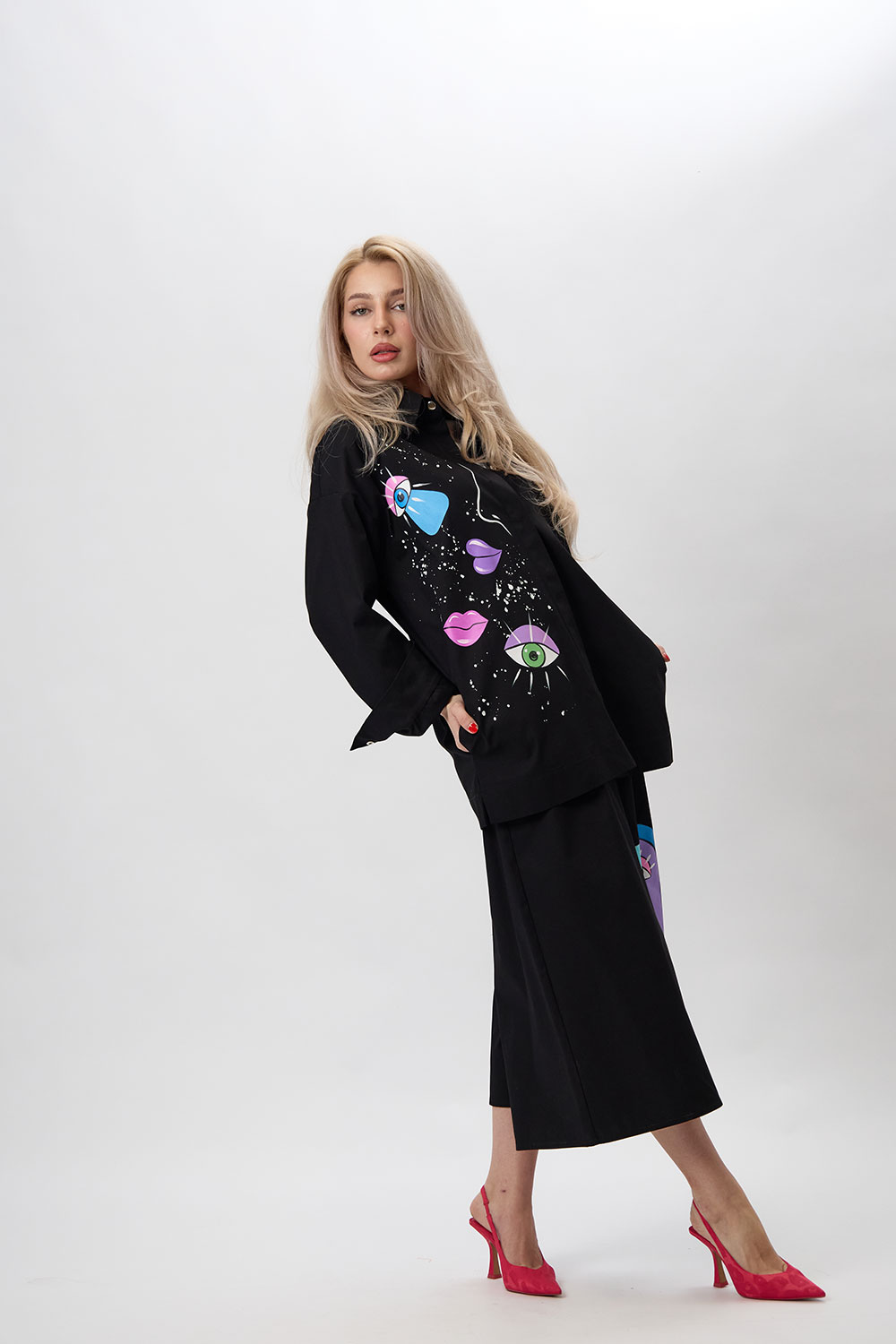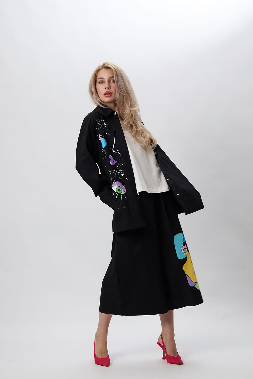 Fii o prezență de neuitat cu această cămașă supradimensionată, o piesă vestimentară ce combină un stil relaxat cu o notă de creativitate. Confecționată din bumbac negru, cămașa impresionează prin calitatea materialului și croiala sa modernă. Detalii practice, precum închiderea cu capse metalice, adaugă un aspect edgy, în timp ce elementul definitoriu, pictura manuală cu elemente abstracte, transformă fiecare piesă într-o operă de artă. Poart-o pentru a-ți exprima personalitatea nonconformistă și pentru a adăuga un plus de originalitate ținutelor tale.