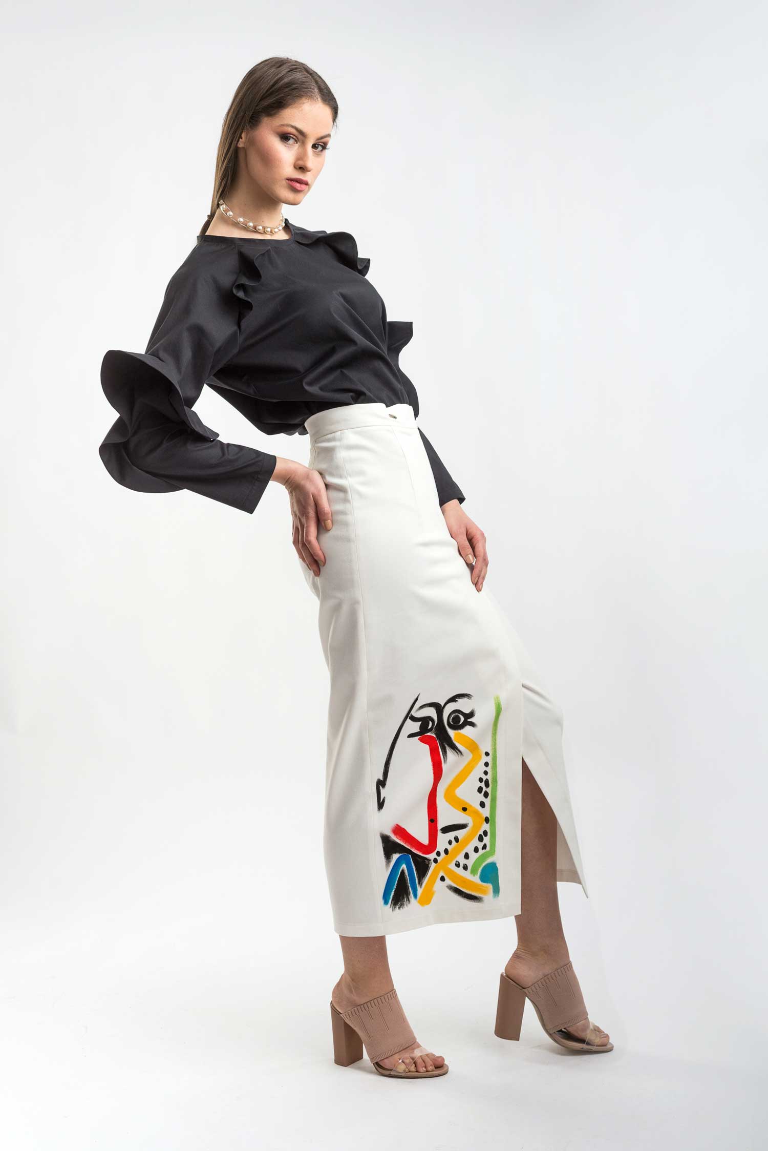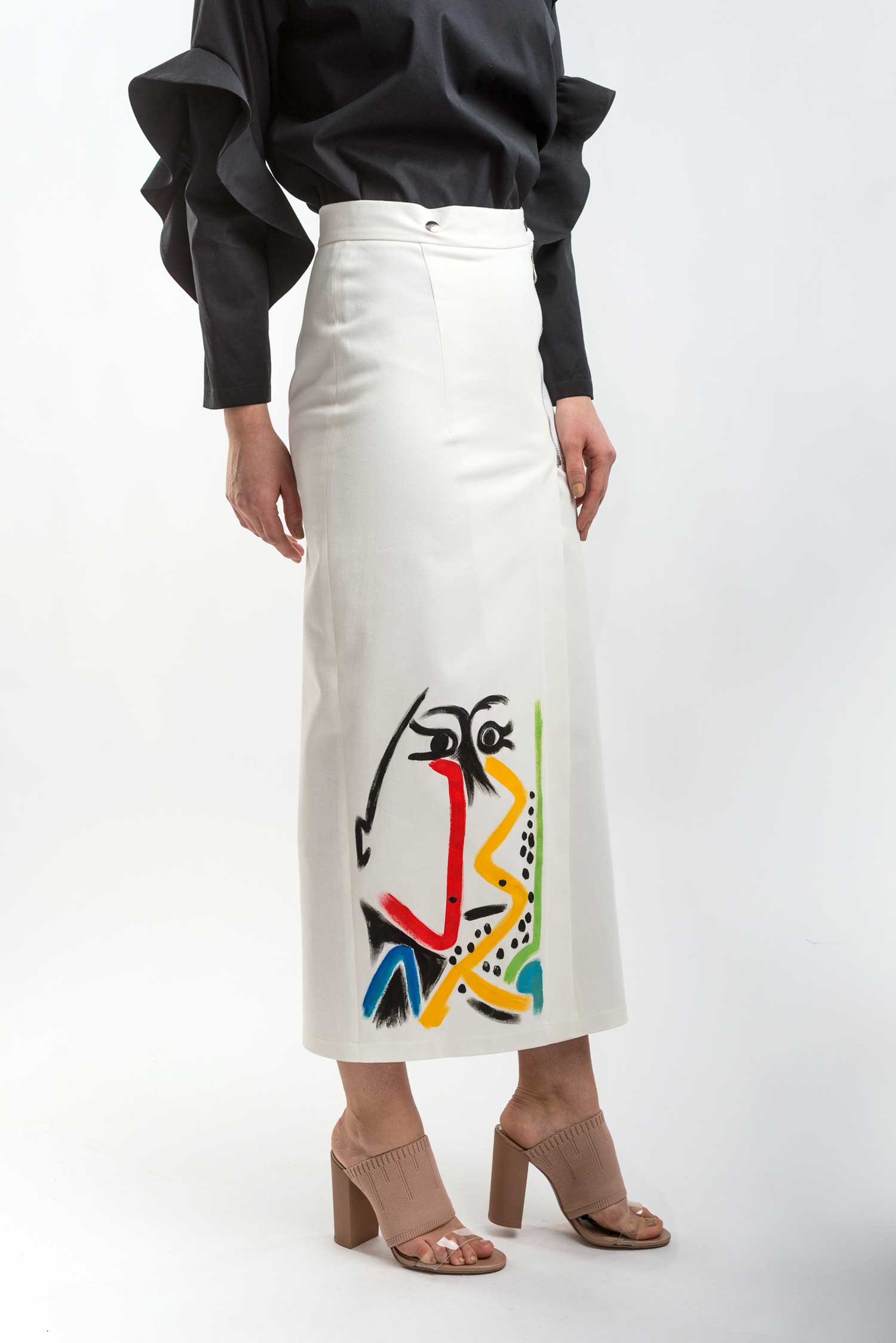 Realizată din doc alb subţire şi cu o pictură inspirată din arta pop, fusta Canvas va întoarce toate privirile şi va aduce originalitate oricărei ţinute. O fustă pe cât de atipică pe atât de versatilă, Canvas poate alcătui o ţinută elegantă, dar şi o ţinută casual-chic cu adidaşi şi un tricou simplu negru şi vestă de blugi.