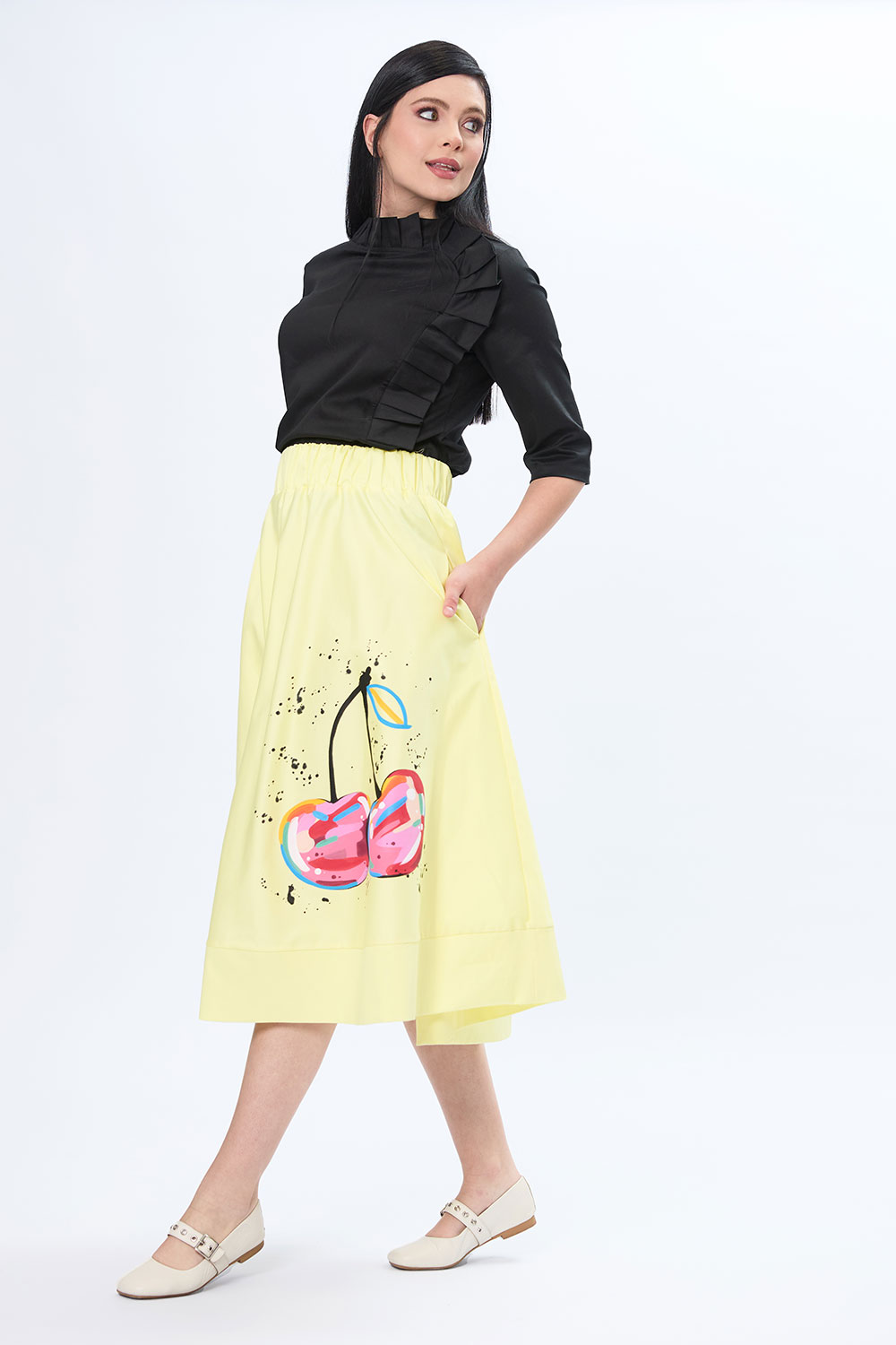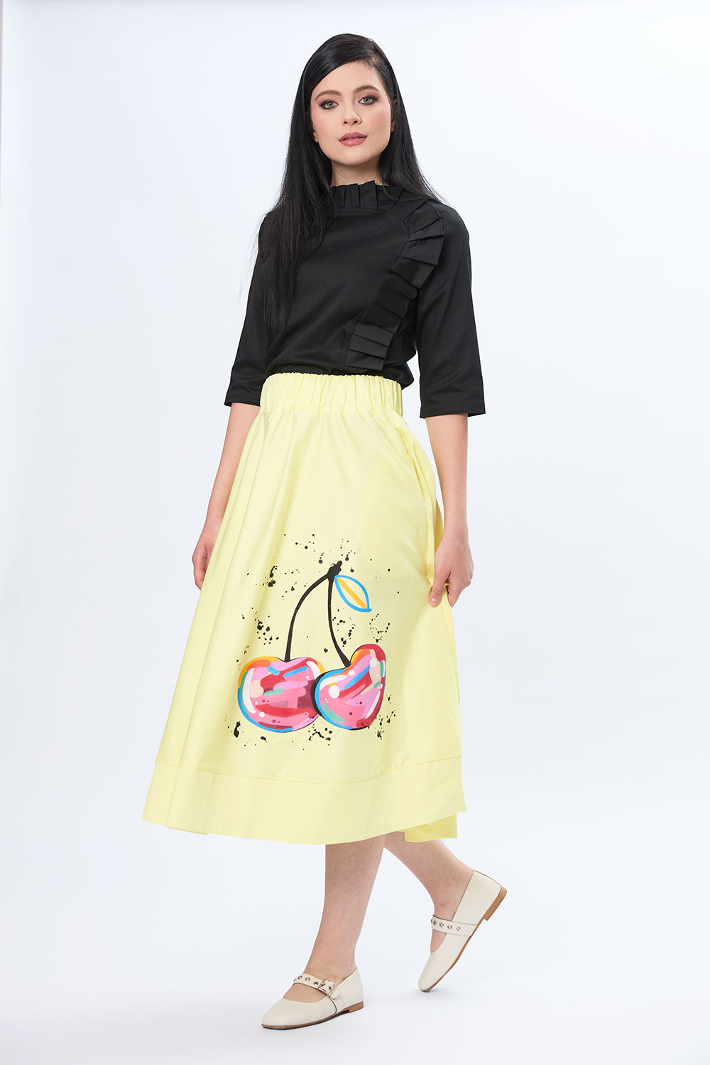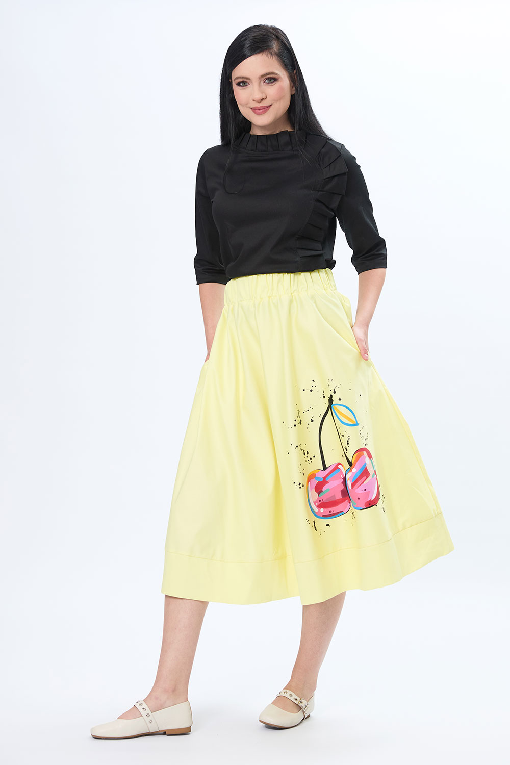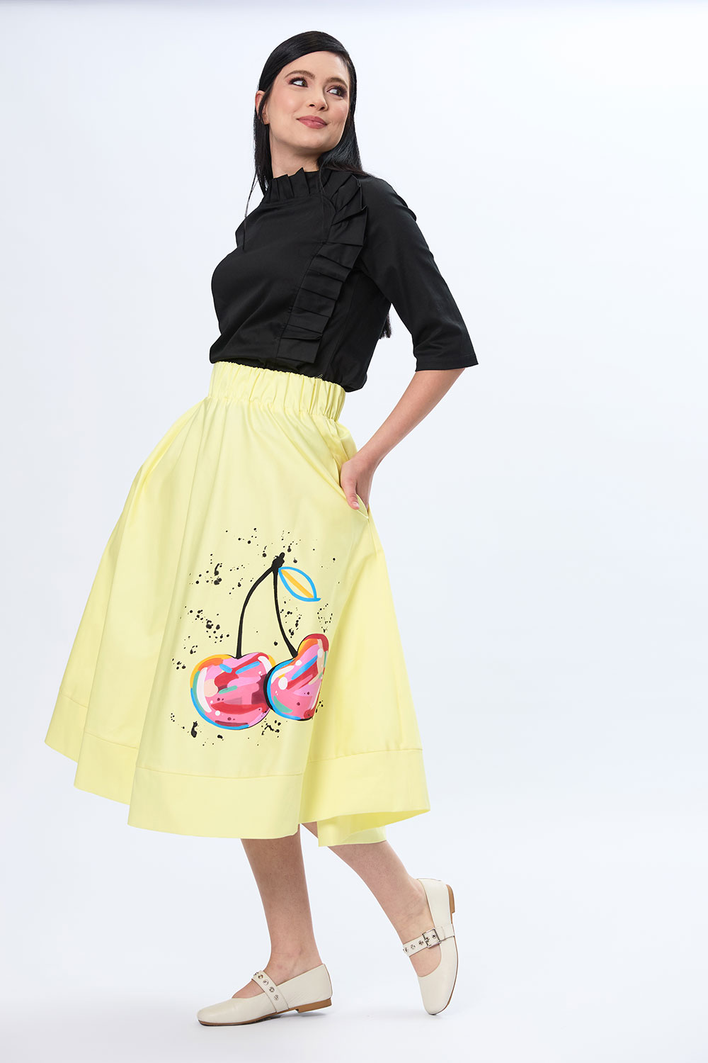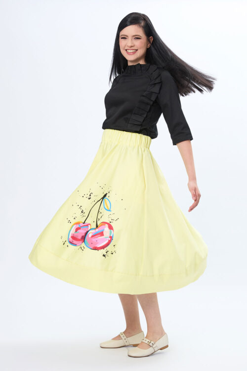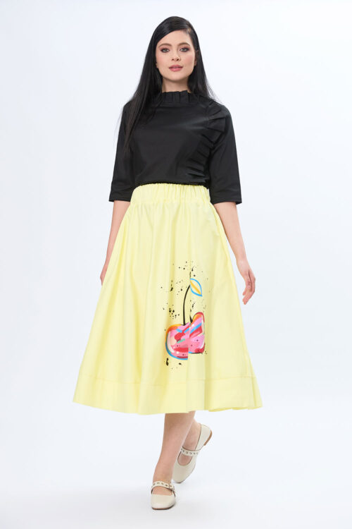 Îți prezentăm fusta “Ceria”, această fustă galbenă vibrantă, cu croială clos care adaugă feminitate și eleganță oricărei ținute. Elasticul în talie și buzunarele utile fac purtarea confortabilă și practică, în timp ce pictura manuală multicoloră, extrem de veselă, completează perfecta ta ținută estivală. Ideală pentru sezonul cald, această piesă îți aduce bucurie și energie oriunde mergi!