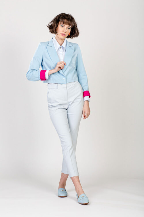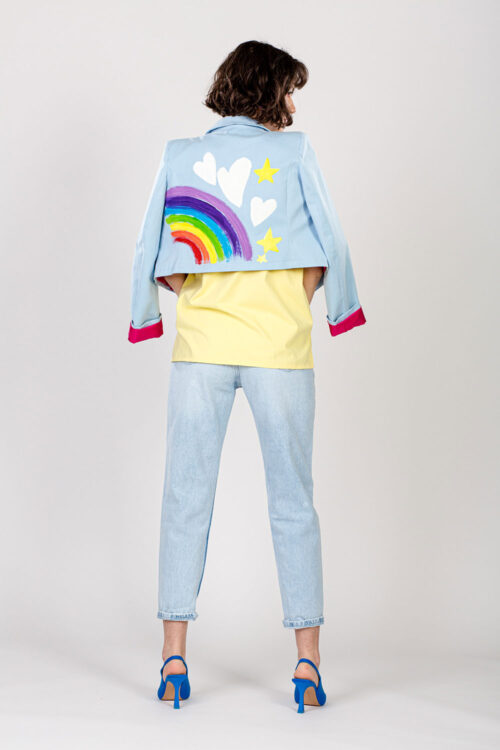 Sacoul “Curcubeu” este una dintre piesele noastre preferate. Este realizat din bumbac bleu stil doc, cu dublură roz aprins, croială dreaptă, până ȋn talie şi o pictură ludică, plină de culoare. Va deveni piesa centrală ȋn orice ţinută ȋl vei integra. Fie că alegi să ȋl porti ȋntr-o ţinută all blue sau cu o pereche de jeanşi largi şi tricou simplu şi tenisi, cu siguranţă te vei simţi minunat.