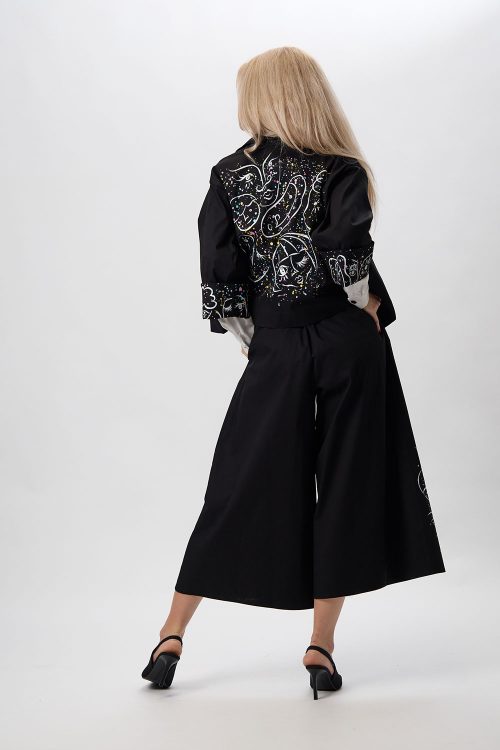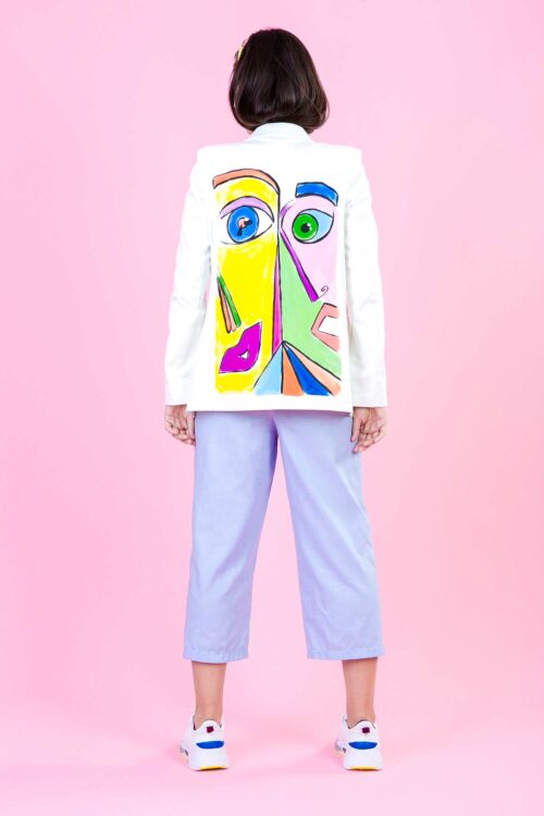 Esti pregatită să întorci toate privirile în această vară. Piesa statement a acestei colecţii, sacoul Tropic Summer te va ajuta să nu treci neobservată la evenimentele acestei veri. Realizat din doc alb şi captuşeală de vâscoză vernil, sacoul este pictat manual în stilul popart. Croiala este dreaptă, bărbătească cu umeri uşor supradimensionaţi. Îl poţi purta cu aproape orice având garanţia că va scoate orice ţinută din anonimat.