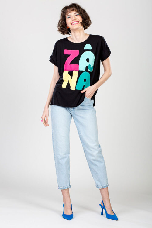 Realizat din bumbac moale, cu aplicaţie realizată manual, cu un mesaj care va ȋntoarce multe priviri, tricoul “Zana” este elementul care transformă ţinuta ȋn una cu personalitate şi optimism. Are o croială dreaptă, lejeră, manşete suprapuse şi şliţuri laterale.