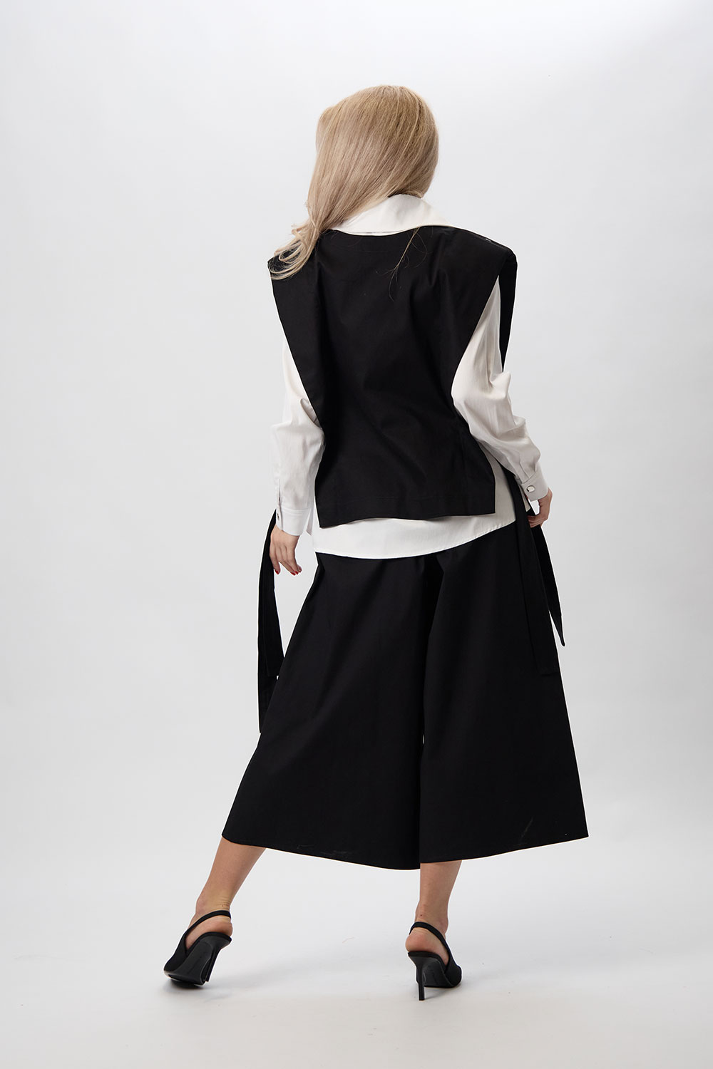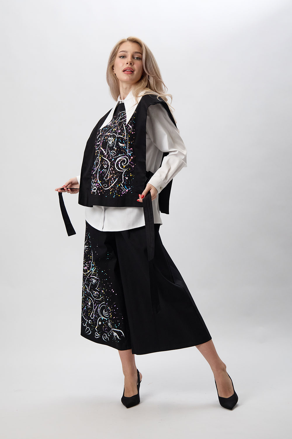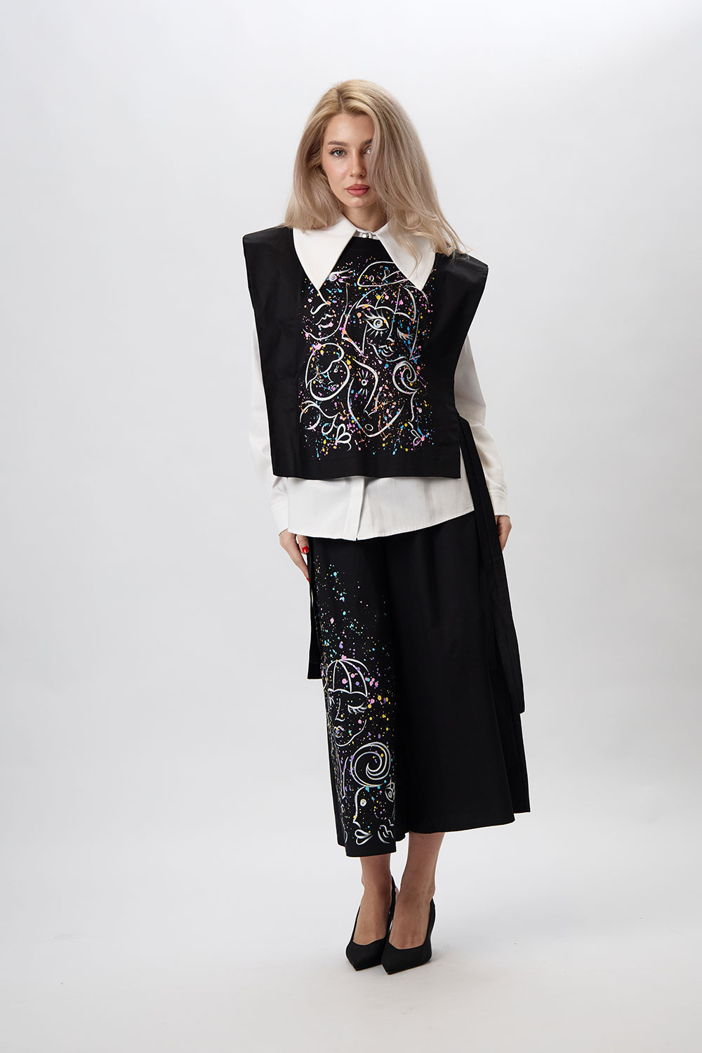 Fii o prezență de neuitat cu această vestă neagră supradimensionată, o piesă vestimentară cu adevărat artistică și modernă. Confecționată dintr-un bumbac de calitate, vesta impresionează prin designul său avangardist, cu umeri supradimensionați și legături laterale care adaugă o notă distinctă. Elementul central este pictura contrastantă și vibrantă, realizată manual, care transformă vesta într-o capodoperă purtabilă. Poart-o pentru a-ți exprima spiritul creativ și a completa outfit-ul tau preferat.